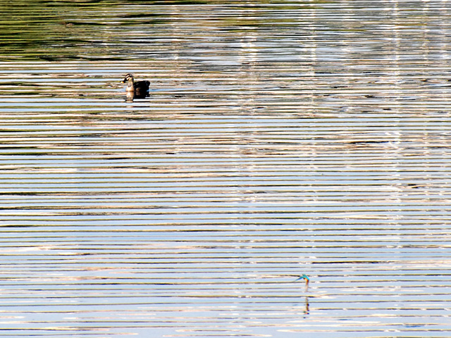 4羽目のカルガモです。手前に偶然にもカワセミの飛んでいるのが写っています。