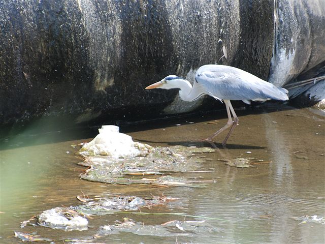 アオサギと笹が瀬川に捨てられたゴミ