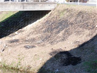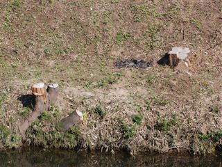 刈り取る以前は、土手の右側土色のところが向こうまで見渡せないくらい竹や木や草で覆われていました。今は、この写真のずーっと奥まで見渡せます。この写真を撮っているところから北、橋が1本2本とありますが、橋2本分の間すべての草木を一掃してしまいました。